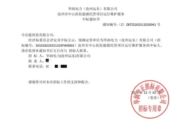 12月2日,中启能中标华润电力(沧州运东)有限公司-沧州市中心医院能源托管项目运行维护服务项目。